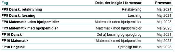 Som et nyt initiativ gennemføres der i skoleåret 2025/2026 også forcensur i FP10 dansk, engelsk og matematik. Informationen om dette kan ligeledes findes på ovenstående hjemmeside. Nedenstående prøvesæt vil indgå i forcensuren. Hvis jeres skole planlægger at anvende tidligere prøvesæt i undervisningen af jeres elever, anbefaler styrelsen, at I ikke anvender de nedenstående prøvesæt, så I stadig har mulighed for at deltage i forcensuren for 2026.